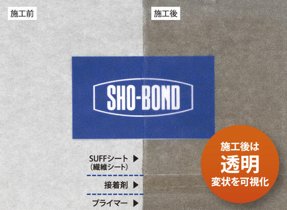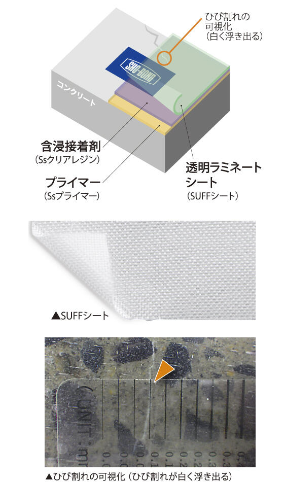 仕上がり面が透明なため、コンクリートに発生したひび割れ等の変状を目視確認できます。 (最小視認ひび割れ幅:0.05mm~)